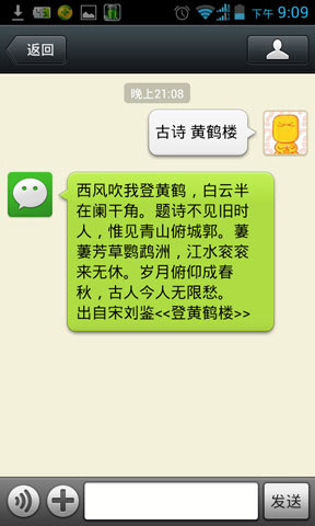 输入:古诗+诗名或者古诗+诗名+作者,可以欣赏这首完整的诗歌。